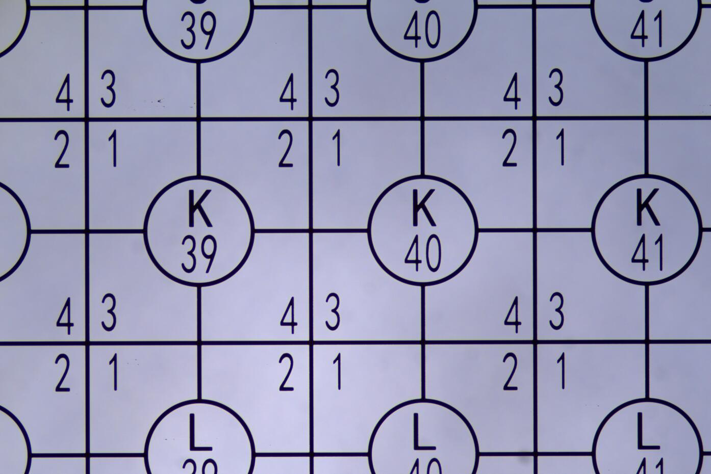 带有参考字母和编号的中心环,正方形的其余部分细分为编号为1-4的四个部分。参考号水平排列1-50,字母垂直排列A-V,